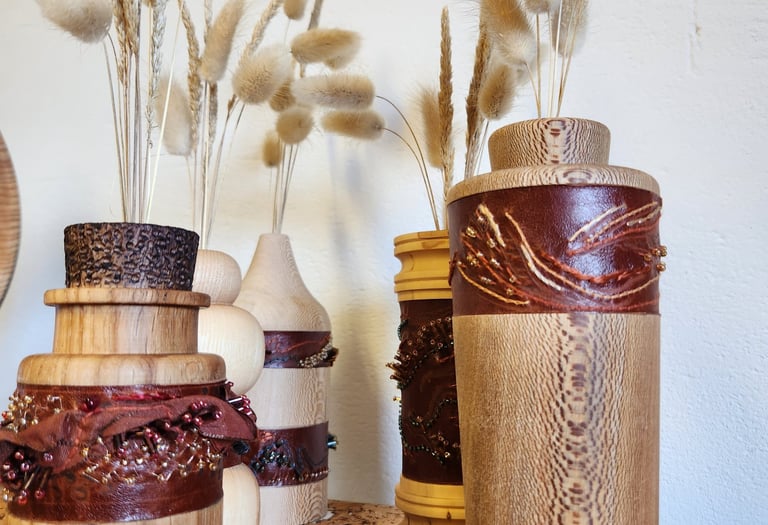 Vase de fleurs séchées en bois avec pyrogravure et broderie d'Art sur cuir