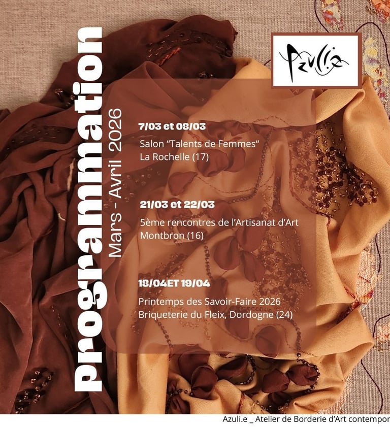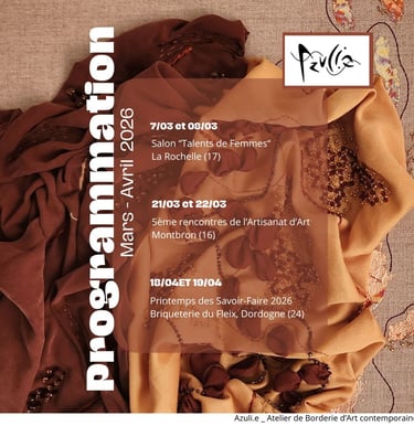 Tenez vous informés sur la programmation des prochains événements, l'occasion de me rencontrer et de découvrir les métiers d'Art et la broderie d'Art avec des démonstrations de broderie.