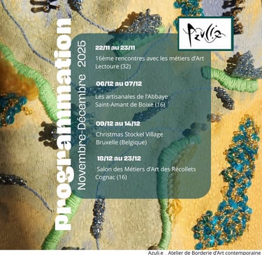 Propose une vision moderne de la broderie d'Art, qui joue sur les volumes, les reliefs, les textures et les couleurs.